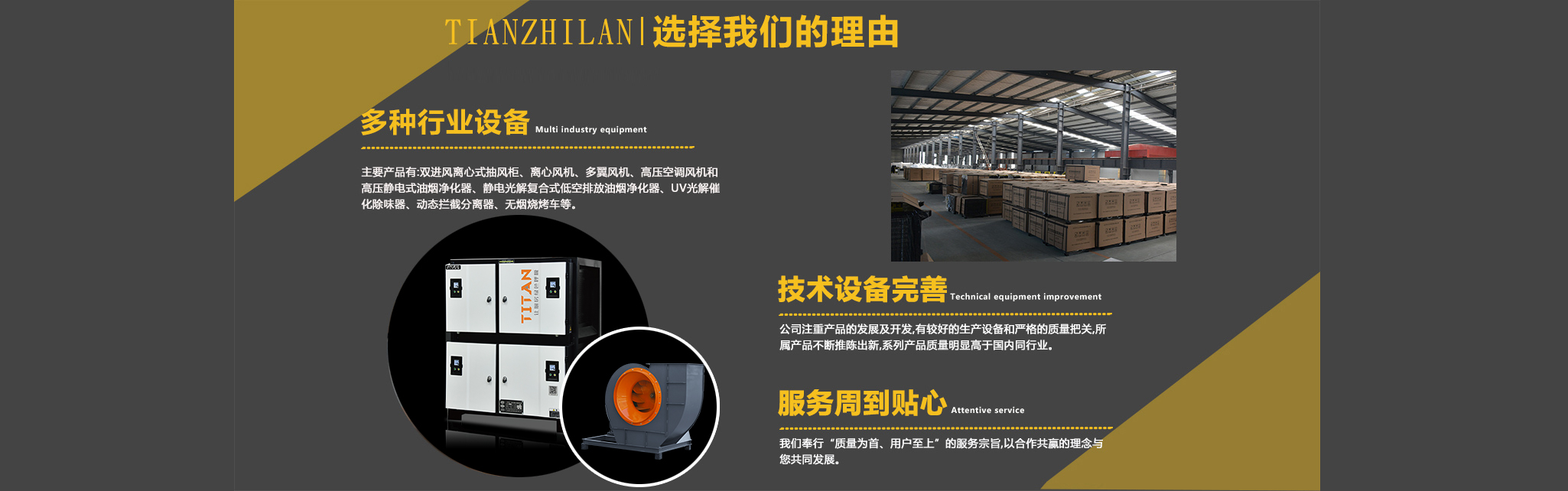 北京天之蘭環保設備有限公司,專營 低空排放油煙凈化器 高空排放油煙凈化器 煙罩一體機 高壓風柜 先鋒系列中壓靜音風柜 空調風機外轉子 等業務,有意向的客戶請咨詢我們,聯系電話:15854349151